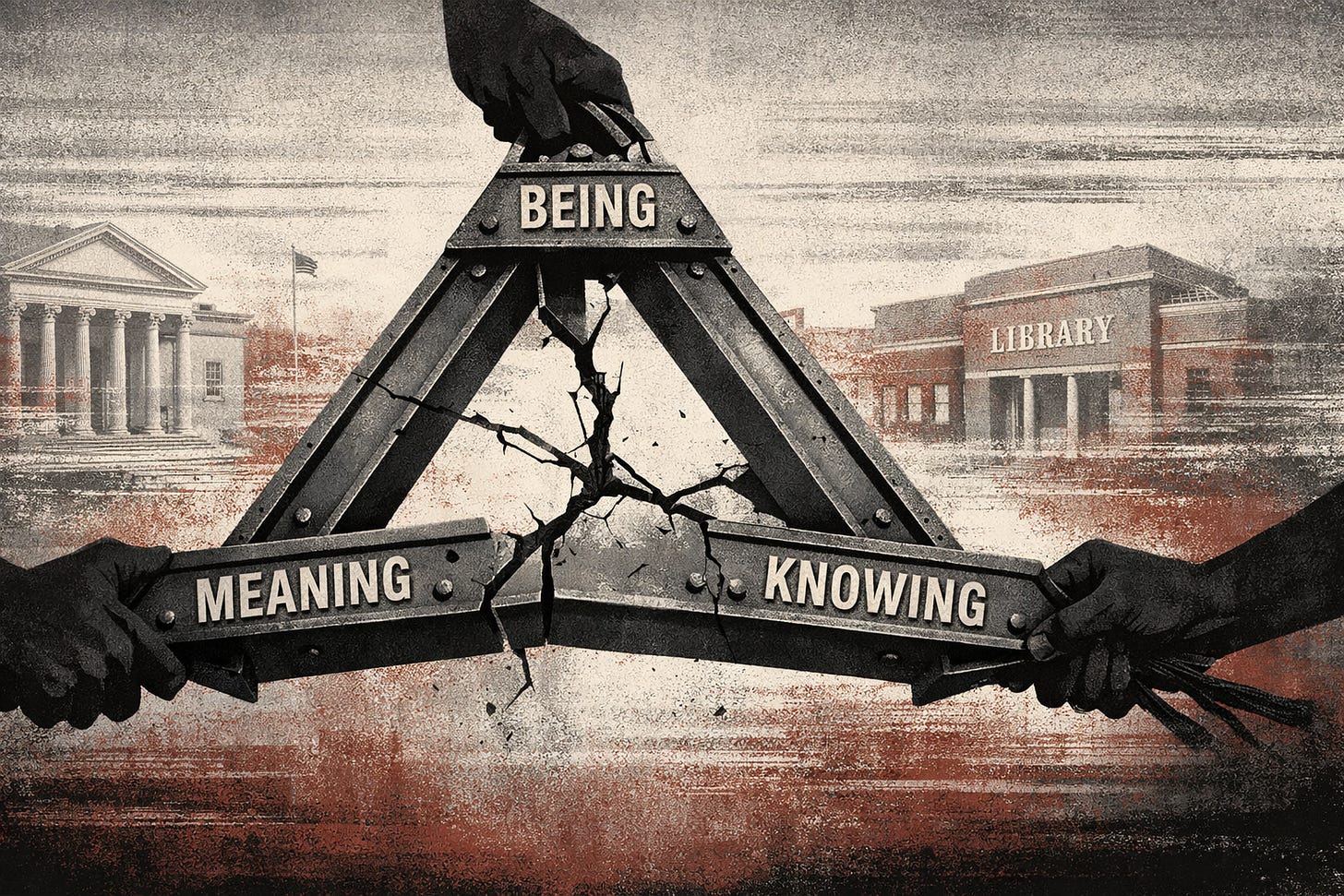 Strip legitimacy from a group (being) and suddenly their knowledge production becomes “biased” (knowing) and their concerns become “identity politics” rather than justice (meaning). Flood the zone with bullshit (knowing), and nothing can be validated, so meaning becomes pure emotional resonance on a loop, and being becomes whoever can scream the loudest. Reframe exploitation as freedom (meaning), and suddenly the people being exploited lose standing to complain (being) and evidence of harm becomes irrelevant (knowing).